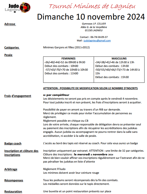 Lors de votre arrivée, chaque responsable de délégation devra se présenter seul au paiement des inscriptions afin de récupérer les accréditations des judokas engagés. Aucun judoka ou accompagnant ne pourra rentrer dans la salle sans accréditation, ni accéder à la salle de pesée.